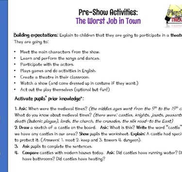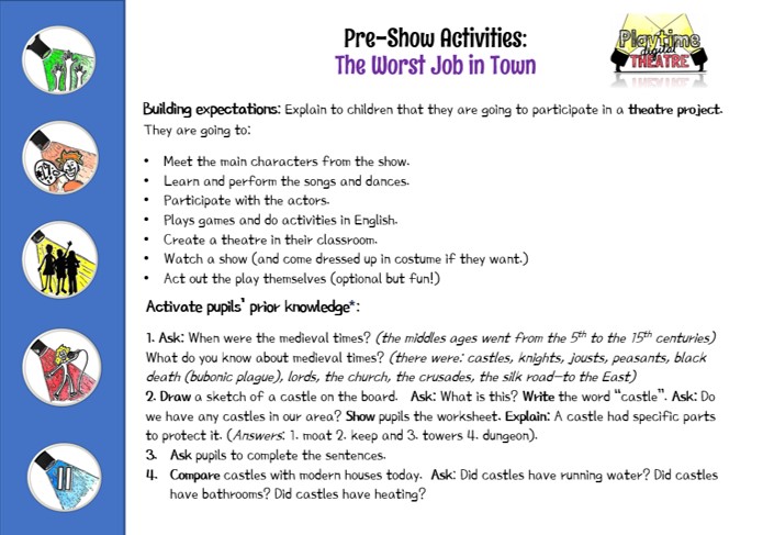 Video 1 is the show preparation video. You will meet the characters, learn the songs and dances and be introduced to the key themes and vocabulary.